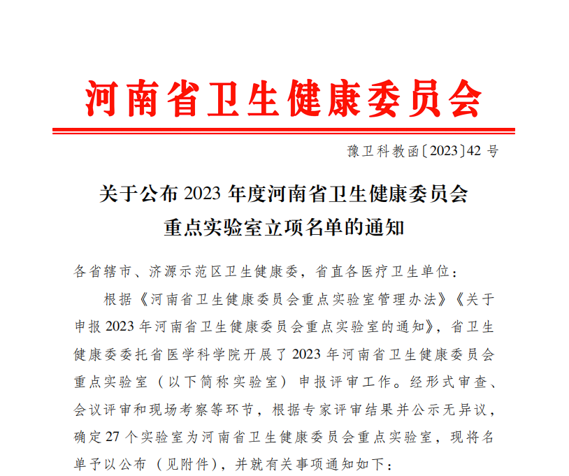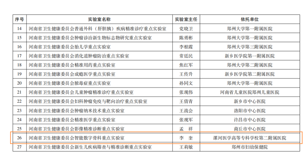 近日,河南省衛(wèi)生健康委員會(huì)公布2023年度重點(diǎn)實(shí)驗(yàn)室立項(xiàng)名單,漯河市骨科醫(yī)院(漯河醫(yī)專(zhuān)二附院)正式獲批建設(shè)河南省衛(wèi)生健康委員會(huì)智能數(shù)字骨科重點(diǎn)實(shí)驗(yàn)室,該項(xiàng)目是醫(yī)院繼2022年獲批建設(shè)省級(jí)工程技術(shù)研究中心后再次獲批建設(shè)省級(jí)重點(diǎn)實(shí)驗(yàn)室。