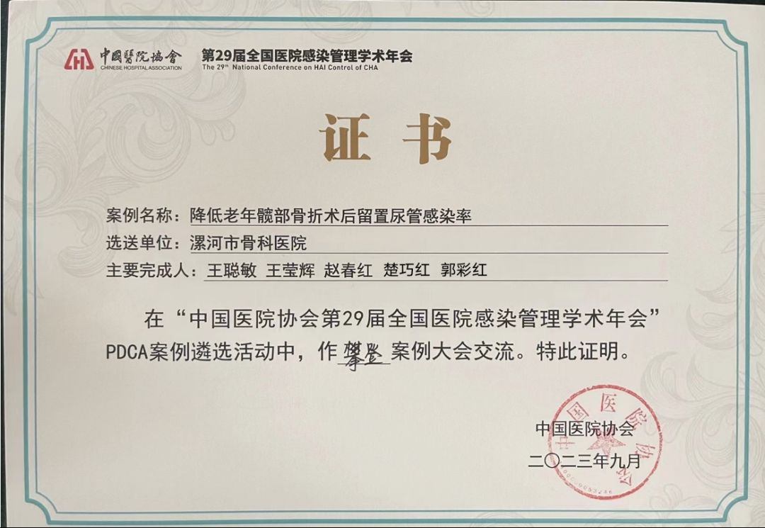 本屆年會為傳播先進理念,展示學術成就,設置了PDCA院感案例交流。會議共征集全國328個案例,通過專家函評篩選,遴選出科學性、實用性較高的75個優秀案例在全國學術比賽現場進行交流與展示。其中,由創傷骨科二病區(骨三科)主要完成的PDCA案例《降低老年髖部骨折術后留置尿管感染率》在全國大賽上進行了精彩展示,并榮獲三等獎“攀登案例”榮譽!
