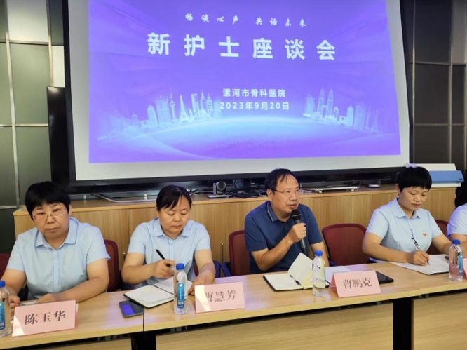 為加強醫院護理隊伍建設,了解年輕護士思想動態,引導新護士成長,凝聚新生力量,切實解決他們在工作中遇到的問題和困難,近日,漯河市骨科醫院(漯河醫專二附院)護理部舉辦新護士座談會。副院長曹鵬克、護理部副主任趙春紅、曹慧芳、王爽及科室護士長代表出席會議,會議由護理部副主任王爽主持。
