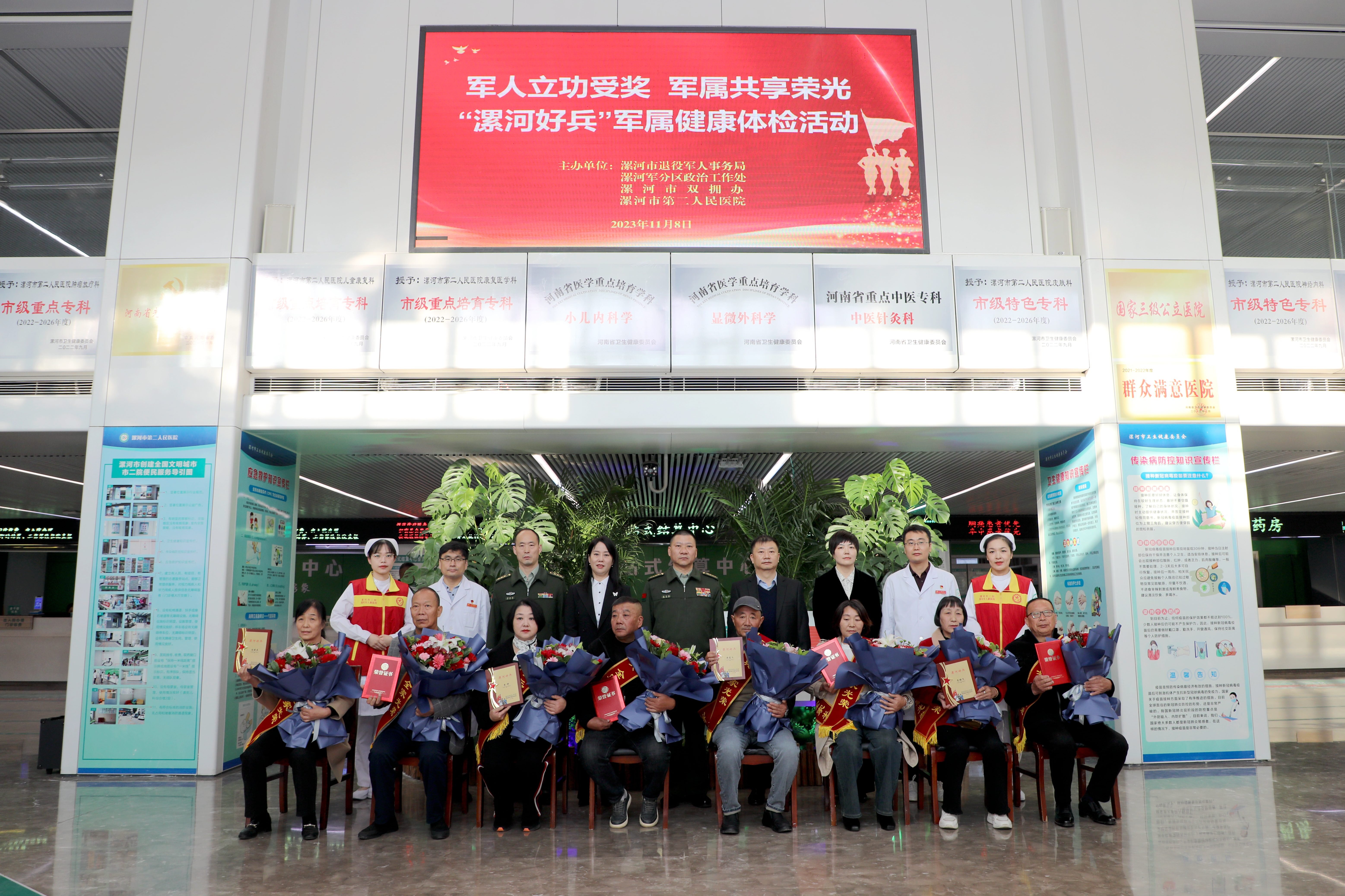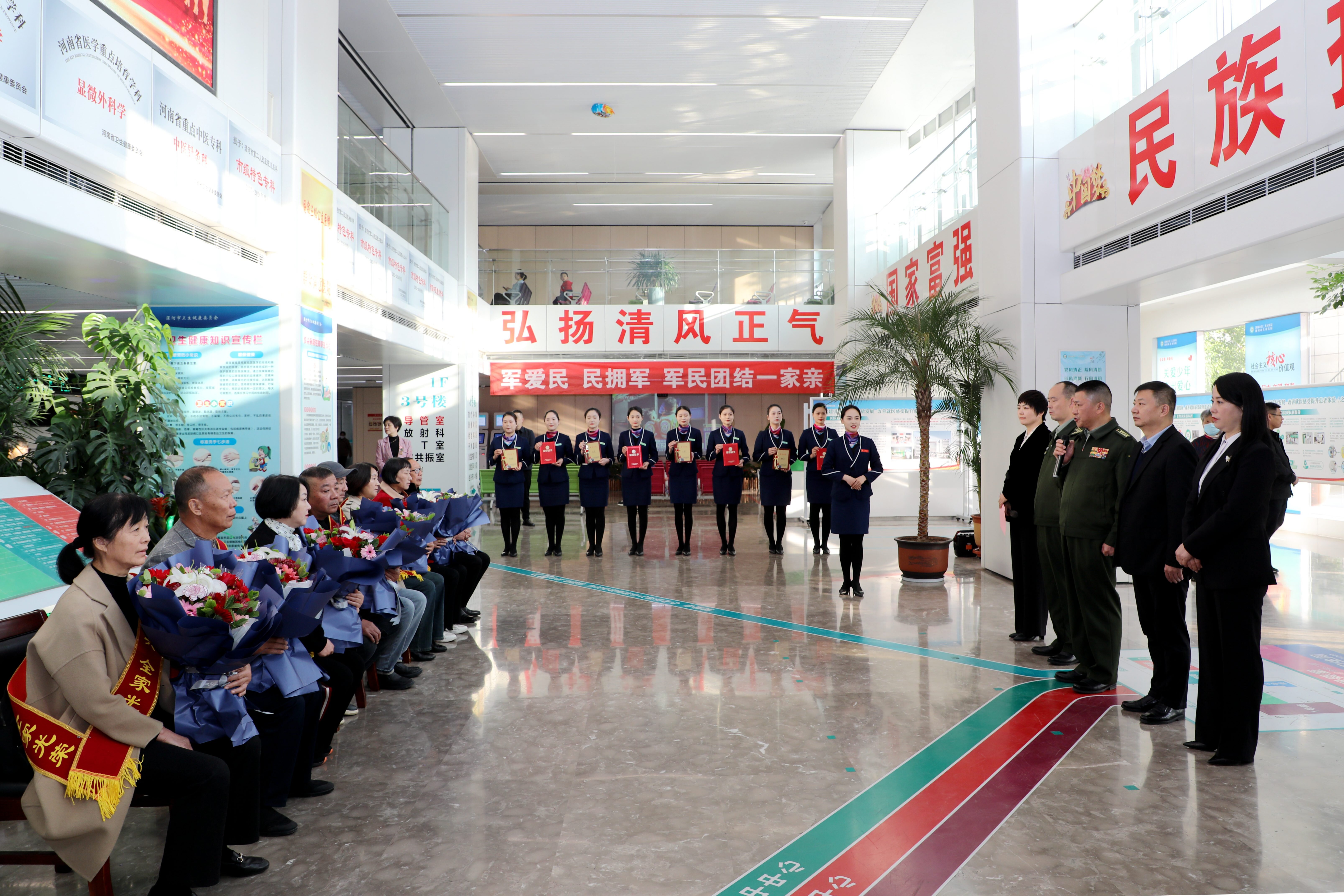 活動中,陳先勝司令員、魏松書記、李世偉主任、彭曉君主任分別向4名“漯河好兵”家屬獻上了鮮花和證書,并與市二院醫護代表共同和家屬合影留念。