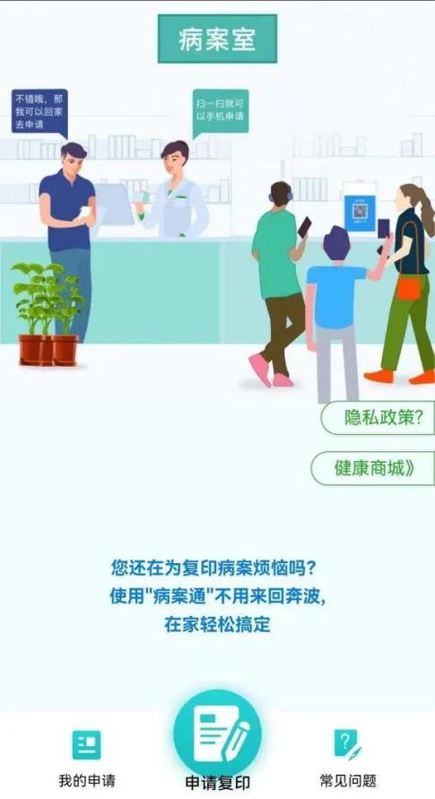 患者在院期間,如需辦理復印病歷,可掃碼關注“病案通”,選擇漯河醫專二附院,點擊“申請復印”并填寫相關信息,待病歷歸檔后將按照記載信息給予郵寄。