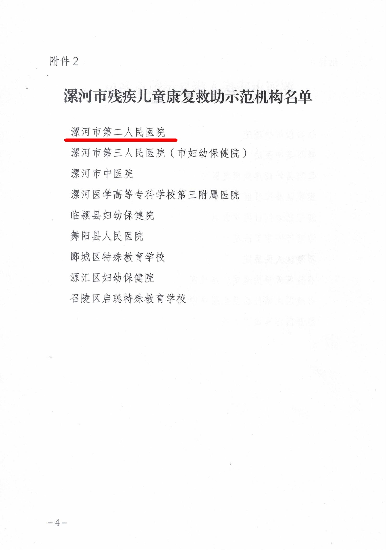 近日,漯河市第二人民醫院被漯河市殘疾人聯合會命名為市殘疾兒童康復救助示范機構!