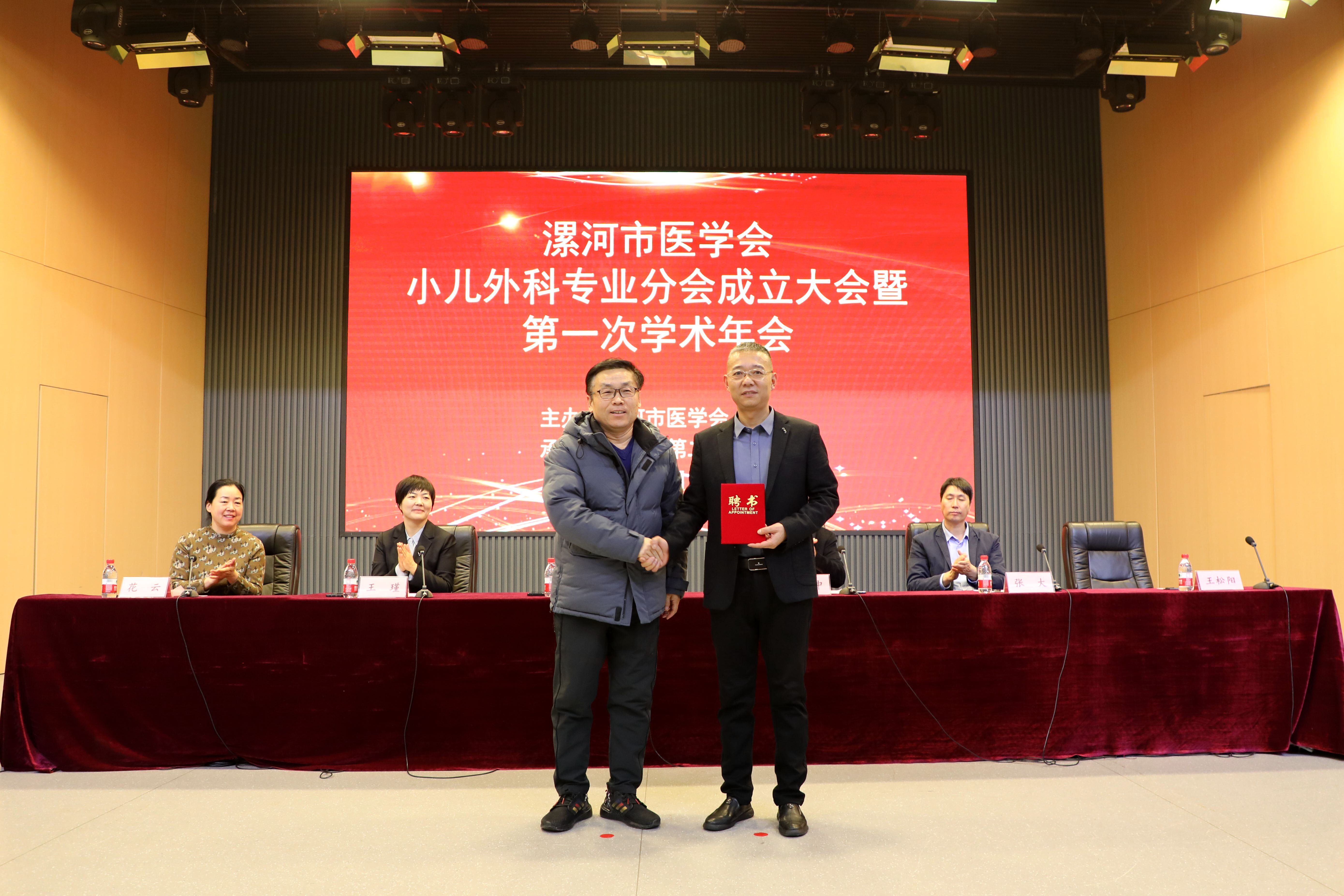 儀式現(xiàn)場,市衛(wèi)健委二級調(diào)研員趙明陽為漯河市首屆小兒外科專業(yè)分會主任委員王松陽頒發(fā)聘書。希望小兒外科專業(yè)分會充分發(fā)揮學(xué)會橋梁紐帶作用,溝通協(xié)調(diào)好各醫(yī)院委員,拓寬思維,大膽創(chuàng)新,積極吸納相關(guān)學(xué)科的現(xiàn)代科學(xué)方法和技術(shù)手段,共同推動漯河市小兒外科事業(yè)的整體發(fā)展。