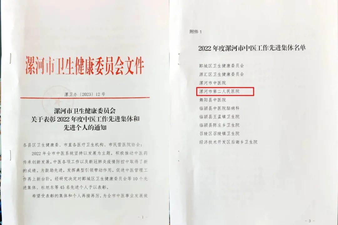 3月2日,市二院被市衛健委授予2022年度漯河市中醫工作先進集體榮譽稱號。