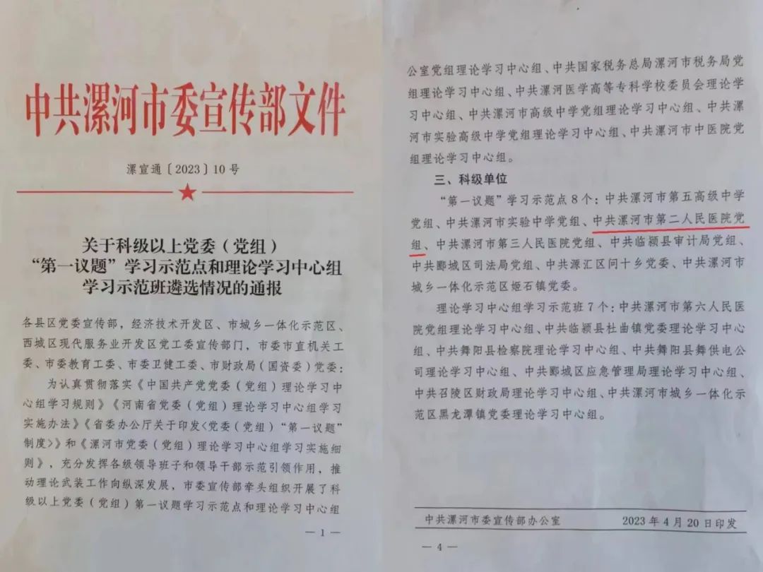 4月26日,市二院黨委被市委宣傳部確定為“第一議題”學習示范點稱號。