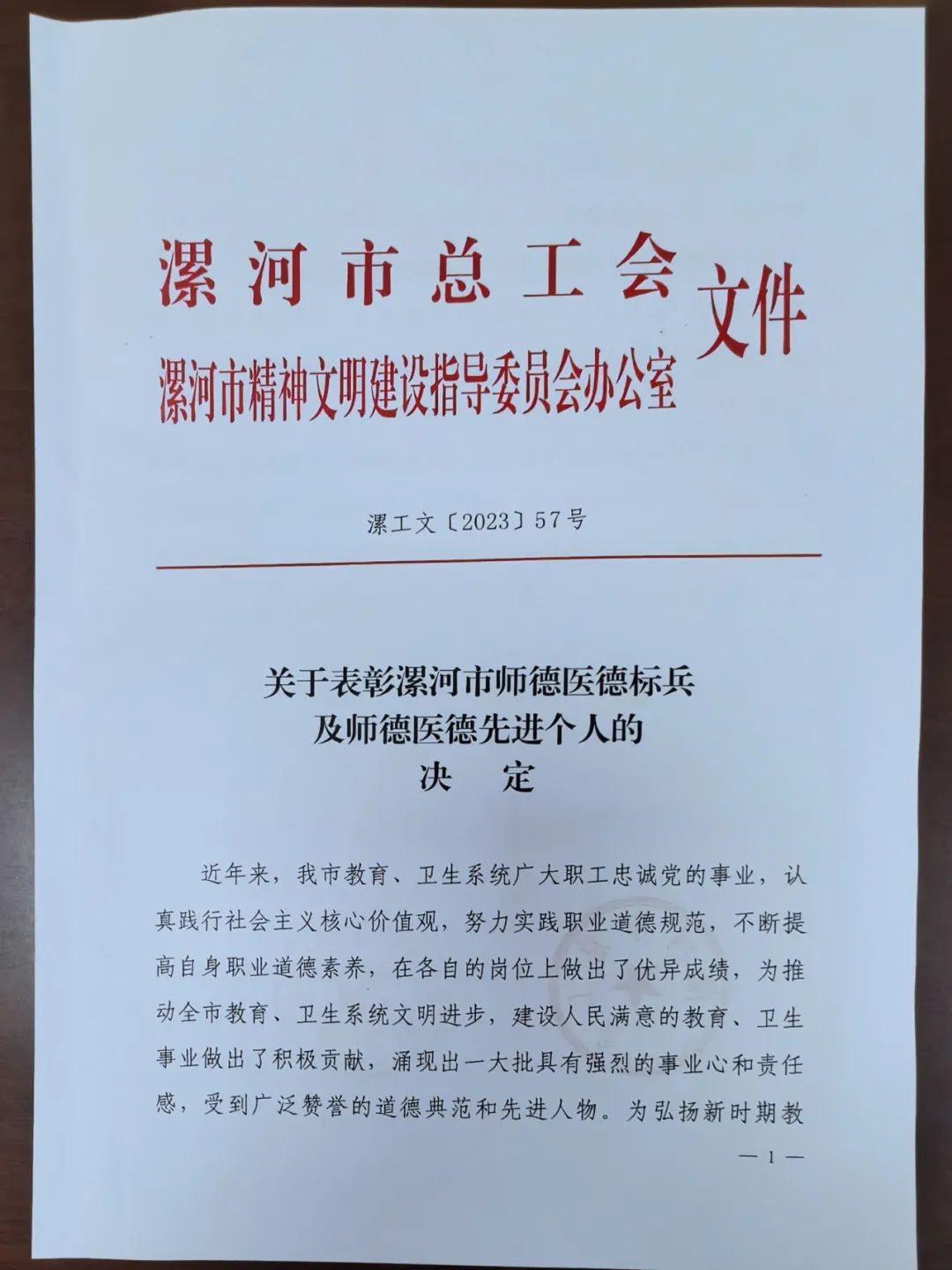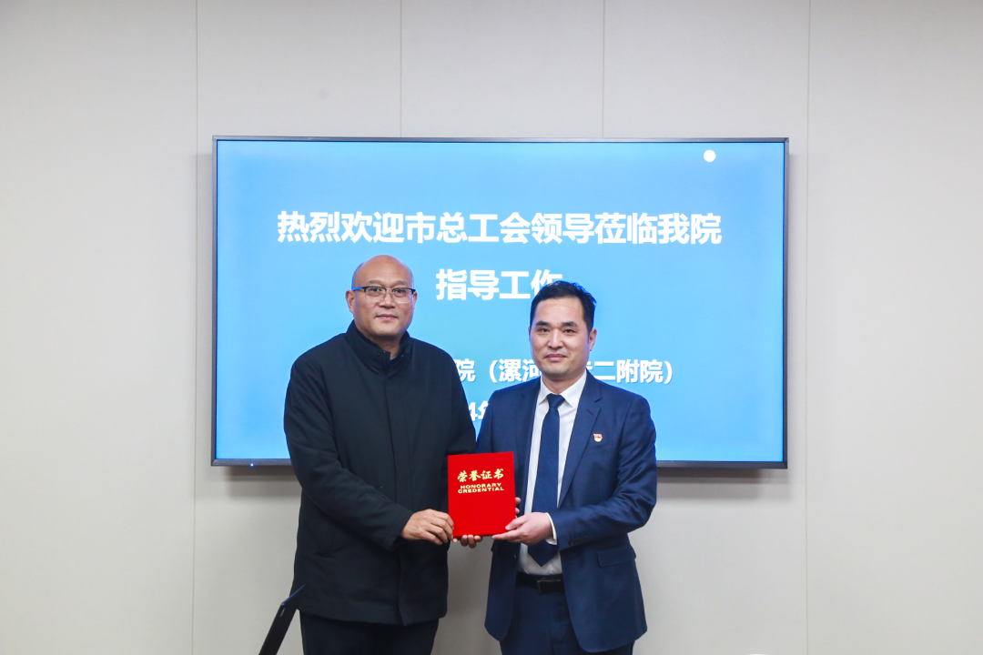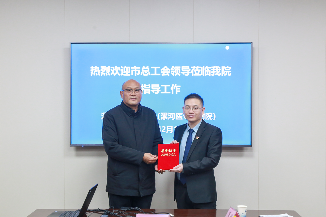 2月1日,漯河市總工會黨組成員、副主席張振凡,市總工會科教文衛體工會主任谷賀衛專程來院將榮譽證書送到陳小村和陳宏峰手中,勉勵他們立足本職、再接再厲,不斷提高道德水平和業務素質,為推動我市衛生事業全面深入發展作出新的更大貢獻。