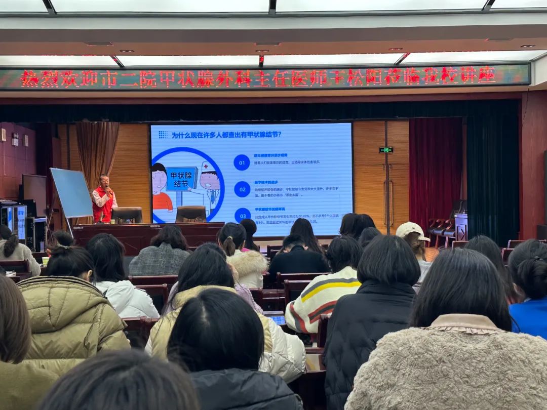 義診結(jié)束后,市二院小兒外科主任王松陽對老師們進行了《甲狀腺結(jié)節(jié)的誘因及防治》知識講座,詳細講解了甲狀腺疾病的常見類型、甲狀腺結(jié)節(jié)的誘因、預防方法和術(shù)前術(shù)后注意事項等知識。