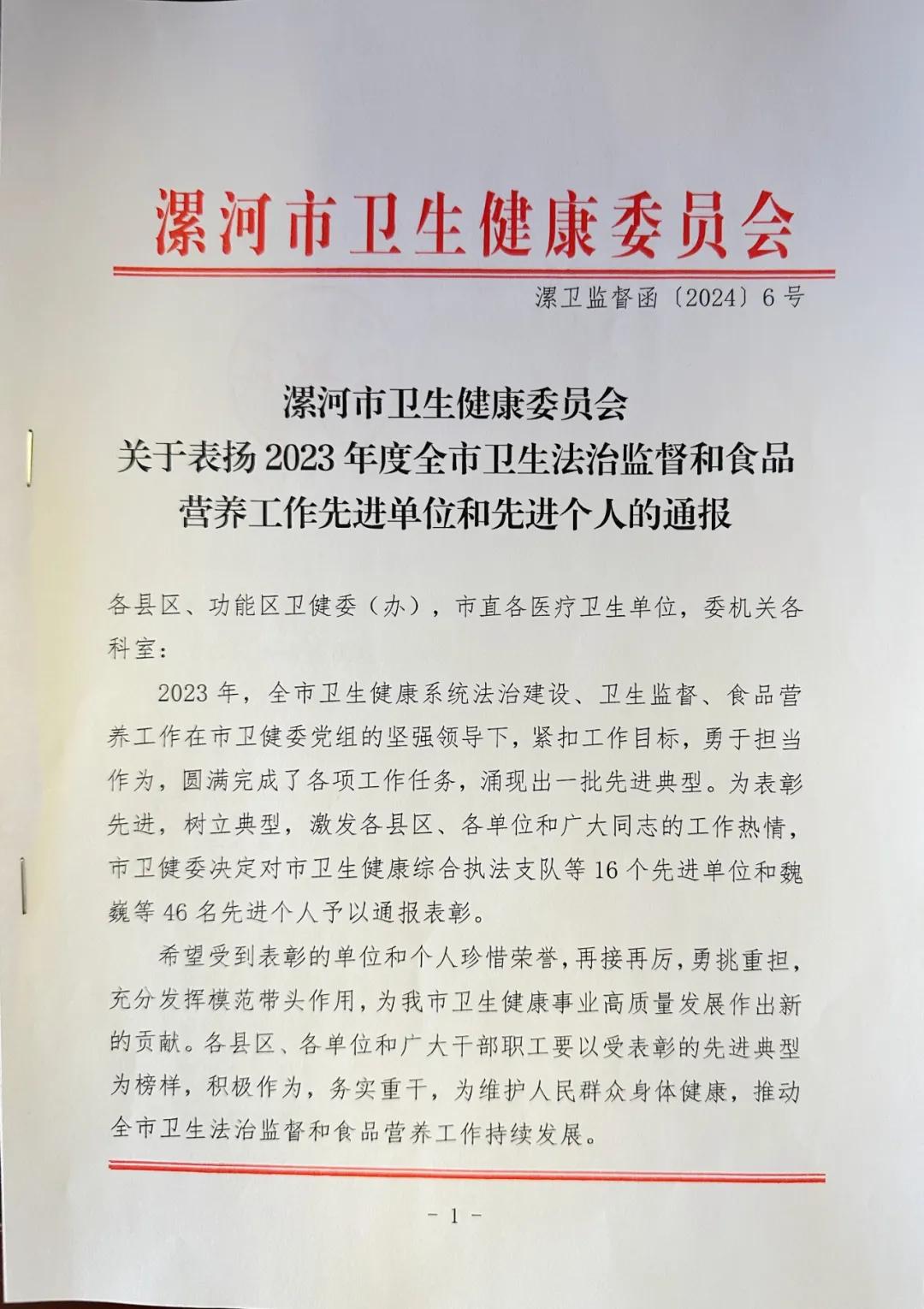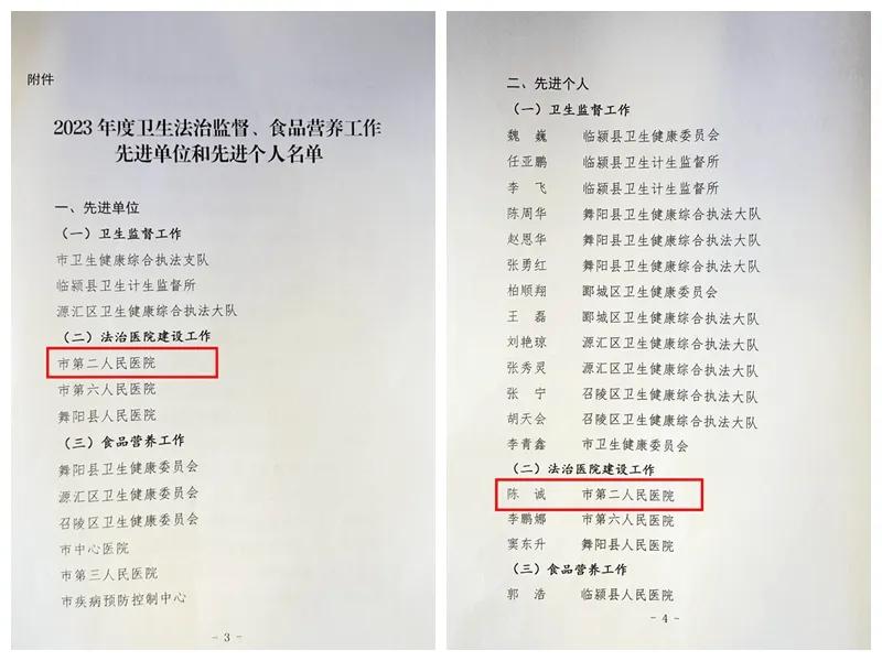 在3月20日召開的2024年度全市疾病預(yù)防控制、衛(wèi)生法治監(jiān)督暨食品營養(yǎng)工作會議上,市二院榮獲2023年度全市法治醫(yī)院建設(shè)工作先進(jìn)單位,陳誠榮獲全市法治醫(yī)院建設(shè)工作先進(jìn)個人。