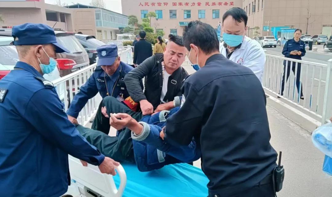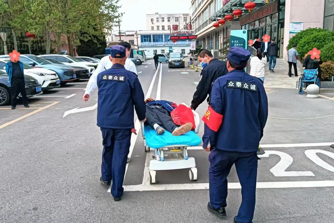 班長王收首先利用醫(yī)院保衛(wèi)科“點對點”的安保設置,通知急診醫(yī)學科駐點的安保人員,及時與急診醫(yī)務人員取得聯(lián)系;同時,安保隊員李文超等人迅速趕到,幫助急診科住院醫(yī)師王英杰一起,將平車推往現(xiàn)場;聞訊趕來的賈俊杰隊長冷靜指揮,多名隊員合力將患者搬上了平車,并迅速轉(zhuǎn)移至急診搶救室。