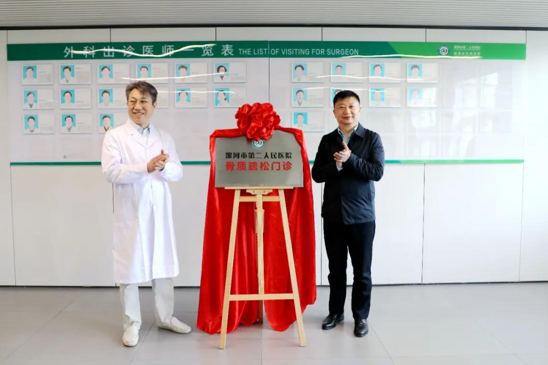 儀式現場,黨委書記魏松與黃宗強教授共同為“漯河市第二人民醫院骨質疏松門診”揭牌。