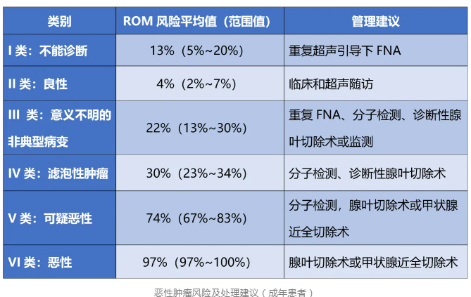 Ⅵ級:惡性腫瘤,細胞學特點是標本細胞形態(tài)無可爭議為惡性。惡性腫瘤包括乳頭狀癌(PTC)、濾泡癌、髓樣癌等,臨床建議甲狀腺全切或腺葉切除。