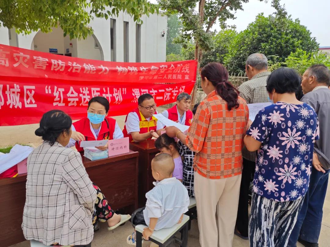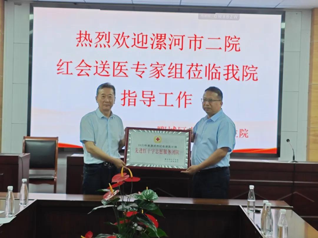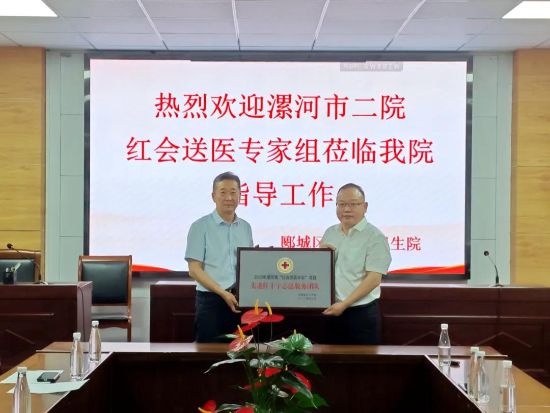 漯河市紅十字會黨組成員、副會長劉國防,市二院副院長張曉東,市二院工會主席李世學(xué),郾城區(qū)紅十字會副會長李山峰,龍城鎮(zhèn)衛(wèi)生院相關(guān)負責同志出席了本次對接會議和義診活動。對接會上,市紅會副會長劉國防對市二院“紅會送醫(yī)計劃”所做的工作表示了高度的肯定,并向醫(yī)院頒發(fā)了2023年河南省“紅會送醫(yī)計劃”先進單位、2023年漯河市“紅會送醫(yī)計劃”先進單位兩塊獎牌,對市二院李慧新等7名同志獲得省級和市級“優(yōu)秀紅十字醫(yī)療專家志愿者”稱號表示祝賀。