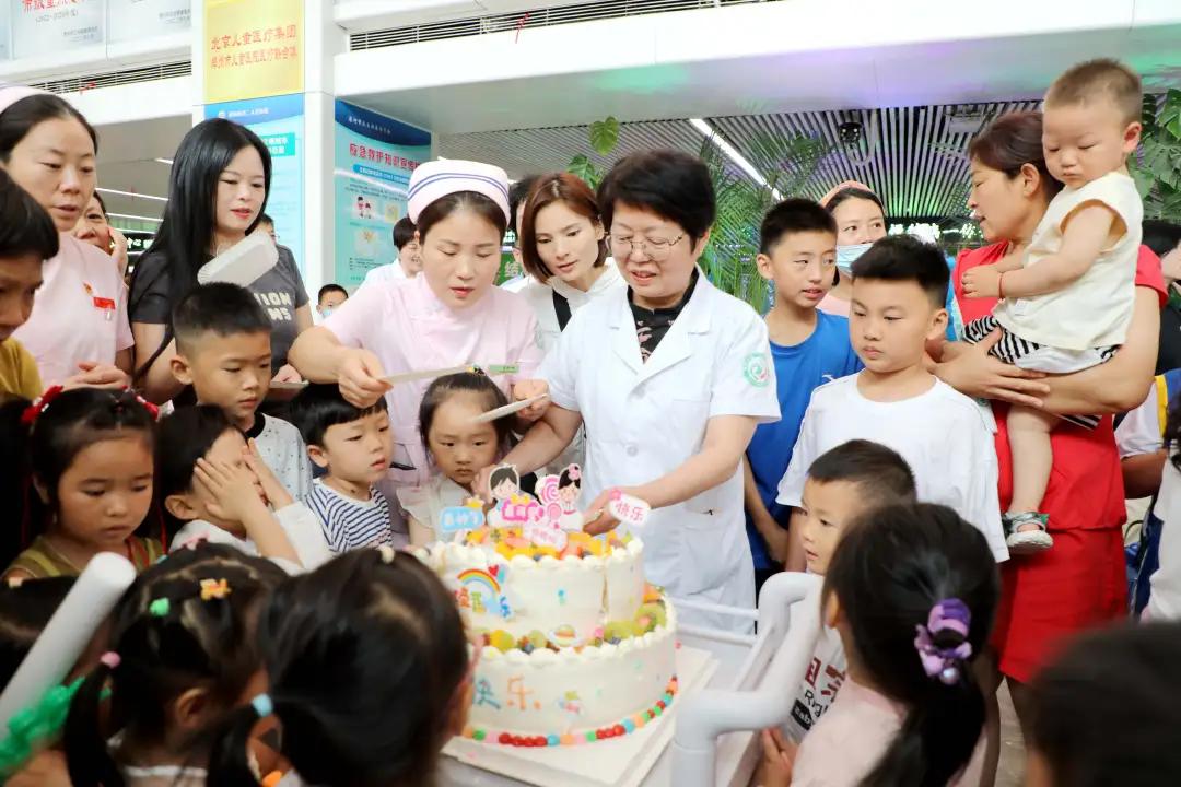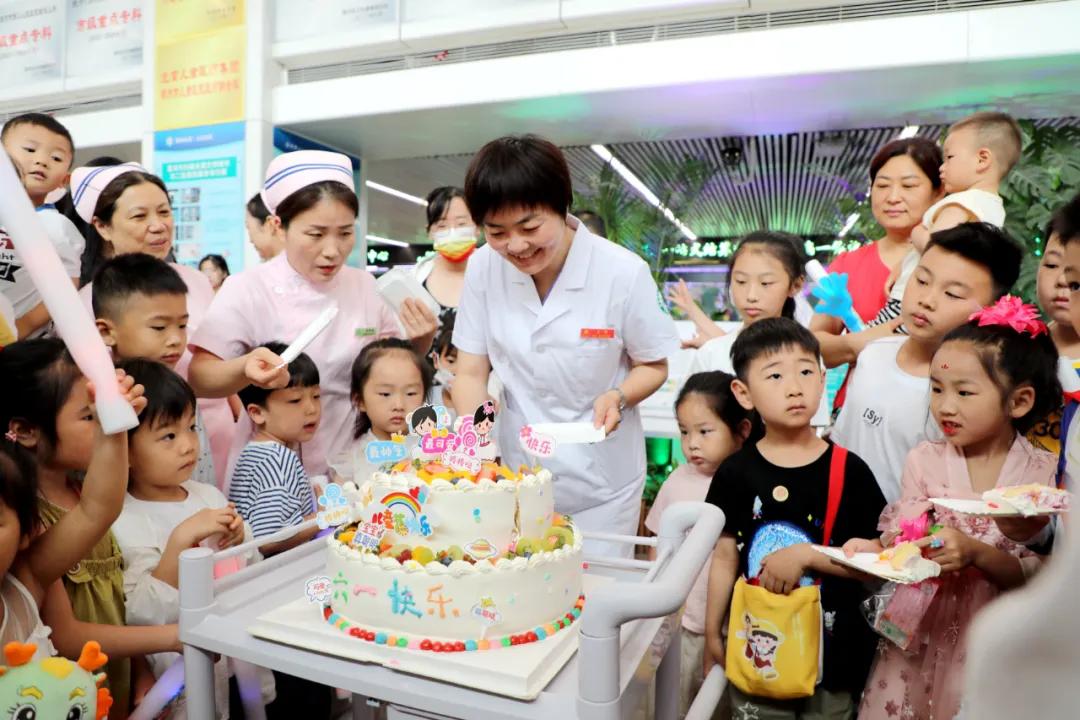 在門診大廳,黨委書記魏松、院長王瑾與兒科專家、護士長、孩子們一起切下節日蛋糕,并代表全院醫護人員對孩子們表示衷心的祝福,希望孩子們健康快樂成長。現場,醫護人員化身白雪公主、花仙子、小黃人、網紅青蛙與小朋友們熱情互動,友好交流,派發精心準備的節日禮物。