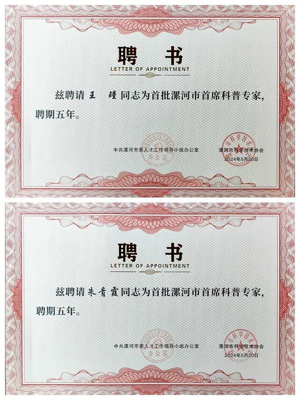 現場,公布了首批聘任的38名漯河市首席科普專家名單,市二院院長、心血管內科主任醫師王瑾與中醫科主任、主任醫師朱青霞,被聘為漯河市首批首席科普專家。
