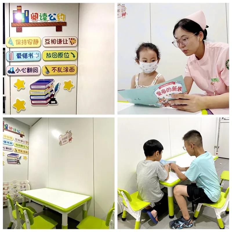 根據孩子年齡不同,放置了適合各年齡段的圖書種類,添置看圖識字語音掛圖,為治療結束的孩子提供休閑娛樂的區域,減少孩子看手機及電視的時間。