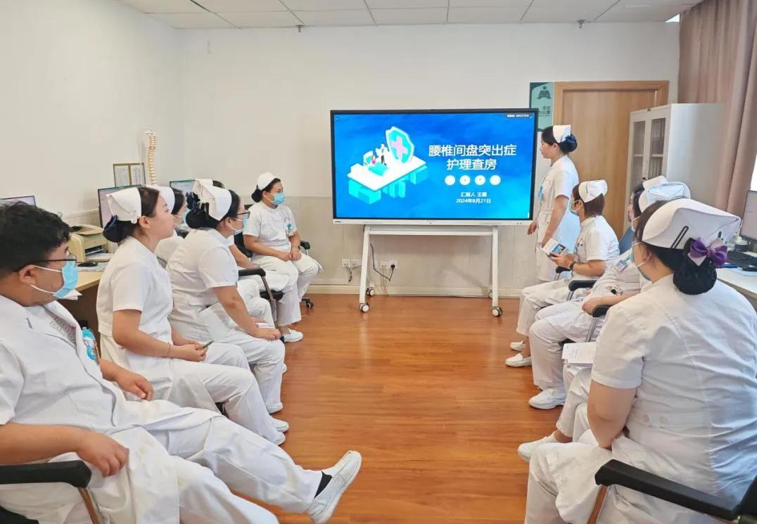 在進行護理查房前,首先由責任護士王露介紹患者的病史及疾病相關知識與治療,針對該患者的護理重點制定專業、個性化的護理管理情況,隨后責任護士帶領大家進行床旁查房,護士長關切的詢問了患者病情狀況,了解是否存在未解決的護理問題,并從患者實際情況出發,制定出具體的護理措施。此外,護士長還交代患者術后注意事項,叮囑患者術后如何規范正確進行腰椎術后的功能鍛煉。