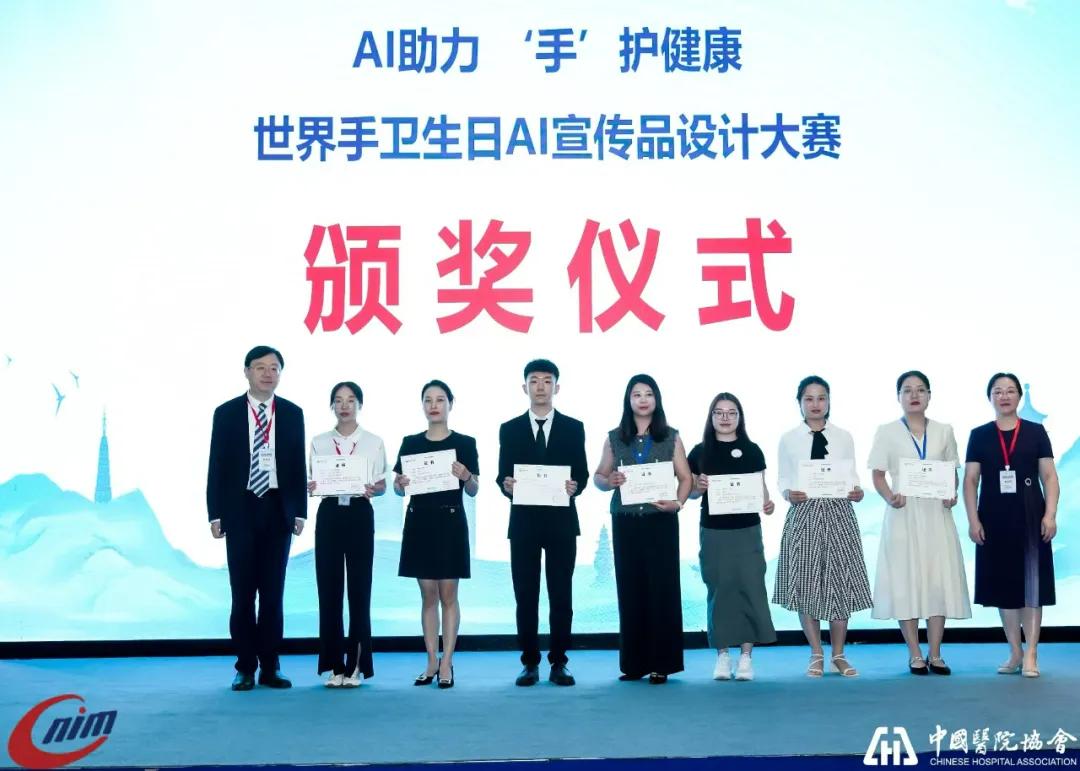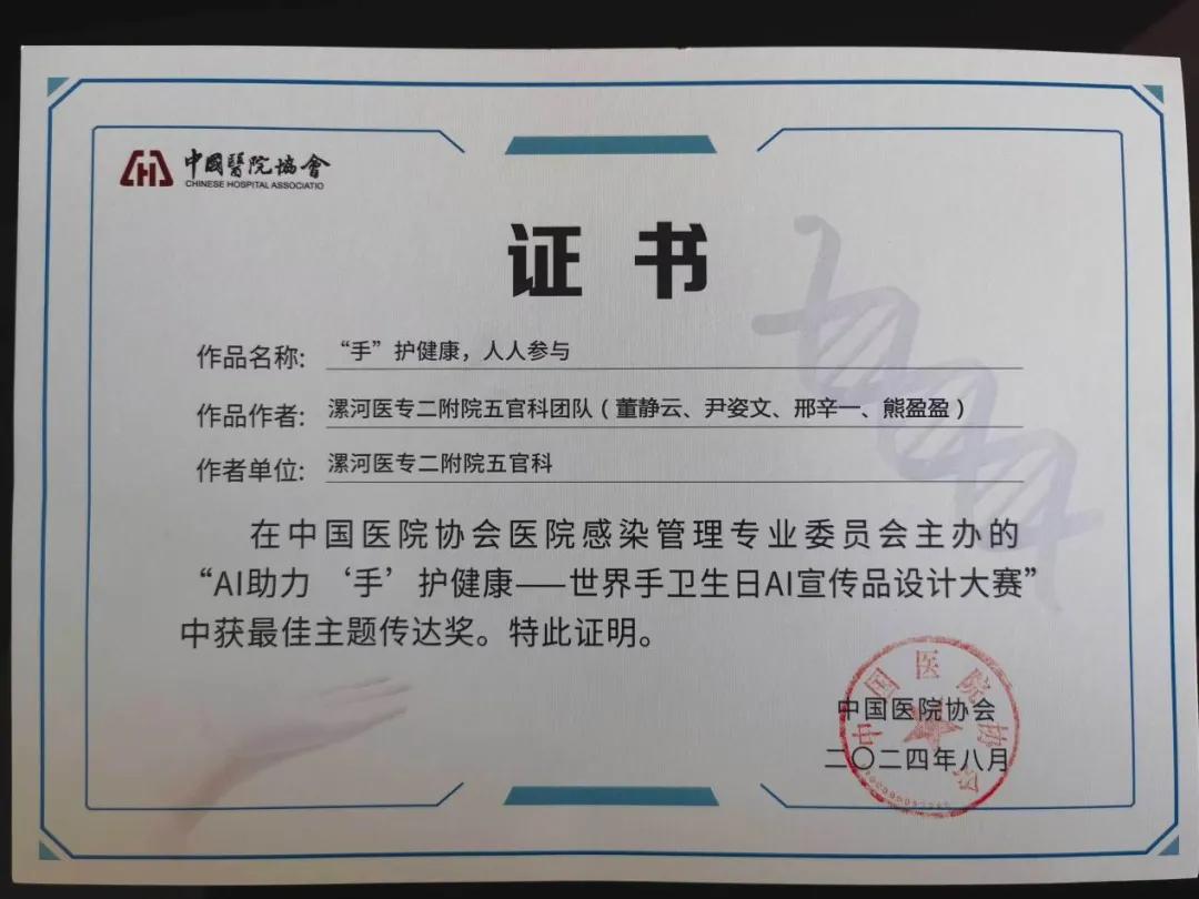 中國醫院協會醫院感染管理專業委員會特別舉辦了世界手衛生日AI宣傳品設計大賽,旨在通過數字技術和人工智能為醫院感染防控培訓與宣傳注入新的活力。活動共收到來自全國29個省/自治區/直轄市100座城市186家單位的384幅參賽作品,入圍40幅作品中河南省內醫院有4所。我院五官科團隊憑借作品“手”護健康,人人參與,在眾多參賽作品中脫穎而出,9月1日在中國醫院協會第30屆全國醫院感染管理學術年會閉幕式、頒獎儀式暨青年沙龍啟動儀式上公布獲獎名單,我院參賽作品獲得最佳主題傳達獎中的最高分。由大會主席、中國醫院協會醫院感染管理專業委員會主任委員、北京大學第一醫院副院長李航及中國醫院協會醫院感染管理專業委員會副主任委員、國家醫院感染管理質量控制中心專家、浙江大學醫學院附屬第二醫院感染管理科主任陸群為獲得最佳主題獎的代表頒獎。這一榮譽不僅是對創作團隊創意與努力的肯定,更是對醫院整體實力、團結協作精神的認可。