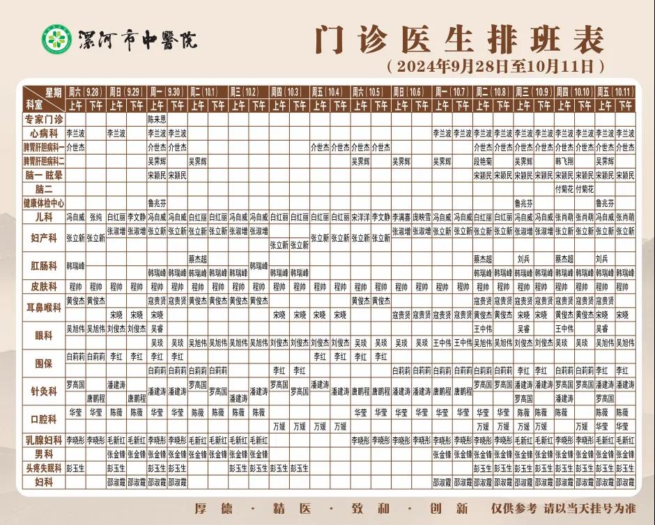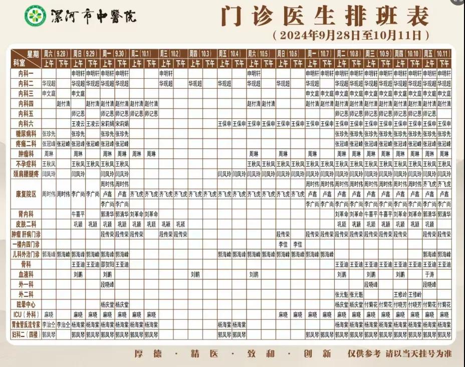 漯河市中醫院國慶節期間門診醫生排班和就醫指南來啦~