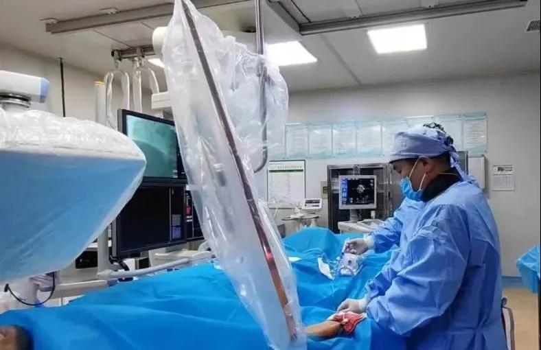 接診醫院急診科醫生與家屬溝通后,緊急派車把病人轉至我院。同時,我院急診醫學科、介入手術室迅速響應密切配合,心血管內科二病區董艷彩主任、馬彥輝副主任在導管室同步做好準備等待病人,最大程度為病人爭取更多時間。
