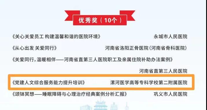 大會通報了系列活動優秀入圍作品名單,其中,漯河市骨科醫院(漯河醫專二附院、漯河市立醫院)報送的作品《醫路書香助力三甲》榮獲“醫路書香、豫健同行”醫院讀書活動亮點特色案例一等獎;《大醫吳廣良》榮獲“身邊的榜樣”敘事醫學故事一等獎;《黨建引領人文綜合服務能力提升》榮獲“員工關愛計劃”優秀案例!