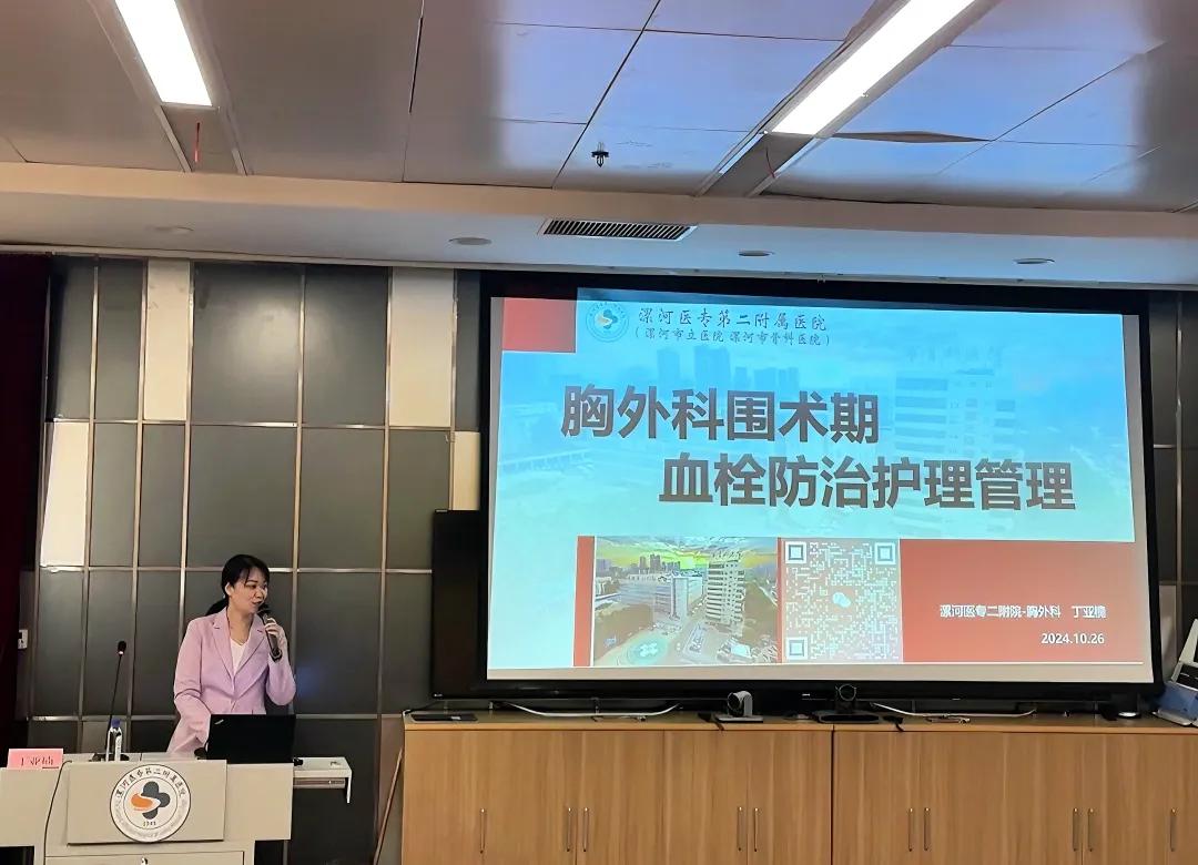 丁亞楠護士長以《胸外科圍術期血栓防治護理管理》為題,講述胸外科血栓防治護理管理是確保患者圍術期安全的重要環節,需要貫穿患者術前、術中、術后及出院后的全過程,通過全面的評估、個性化的預防措施、密切的病情觀察和有效的抗凝治療手段,降低血栓形成的風險,確保患者的安全。醫護不分家,醫療團隊及護理團隊的共同發展才能促進專科建設的發展,丁亞楠護士長促使胸外護理團隊的專科建設,對VTE的防治管理規范管理,為胸外的發展提供助力。