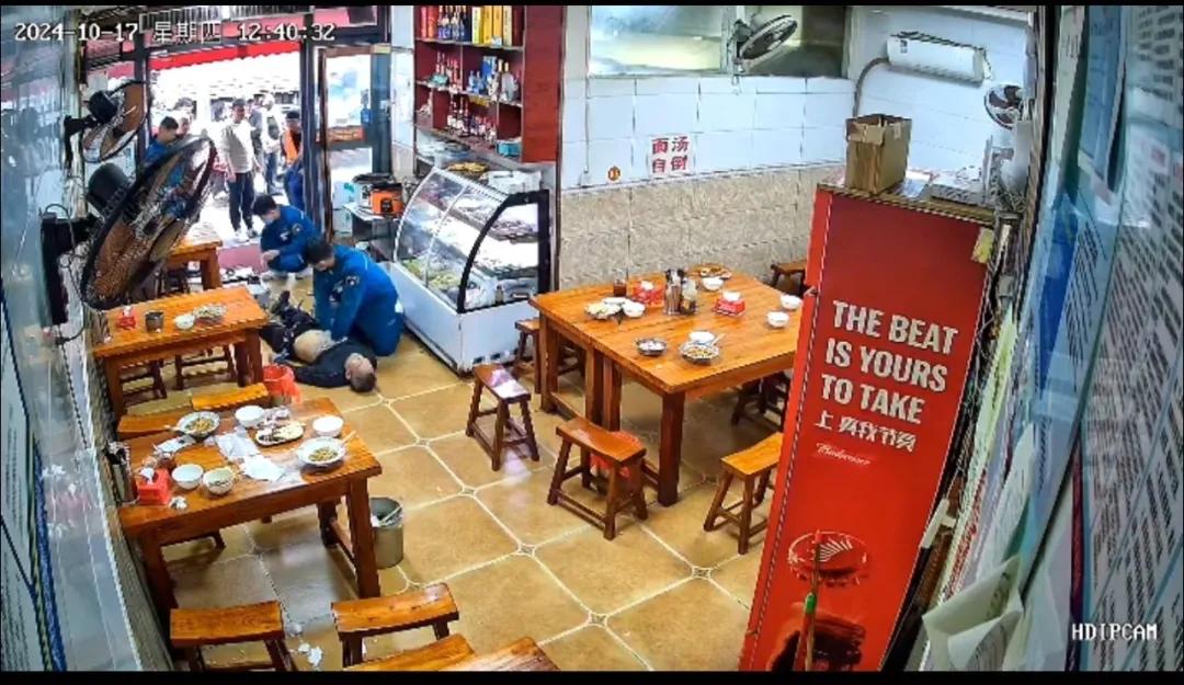 10 月 17 日中午 12 時 30 分,市二院急診科警報鈴聲響起,馬路街有一位中年男性就餐時突然暈倒、昏迷不醒、生命垂危,急需緊急救治。接到出車命令后,120指揮中心及急診科醫生王磊與現場人員保持持續通話,遠程指導,為患者進行心肺復蘇。與此同時,急救人員迅速行動,僅僅 3 分鐘就趕到了現場,快速評估后發現患者頸動脈搏動消失,無自主呼吸。
