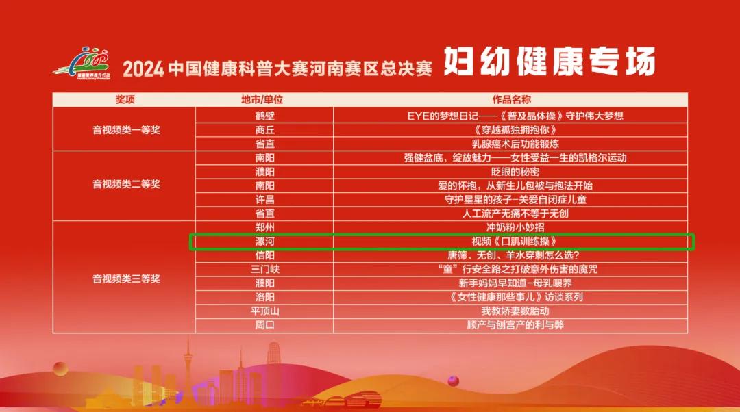 在大賽中,市二院憑借卓越表現,原創作品《雙腿的控訴》獲得慢性病類作品三等獎、《背包俠客》獲得婦幼健康類作品三等獎、視頻作品《口肌訓練操》獲得三等獎,為健康知識普及書寫了精彩篇章。