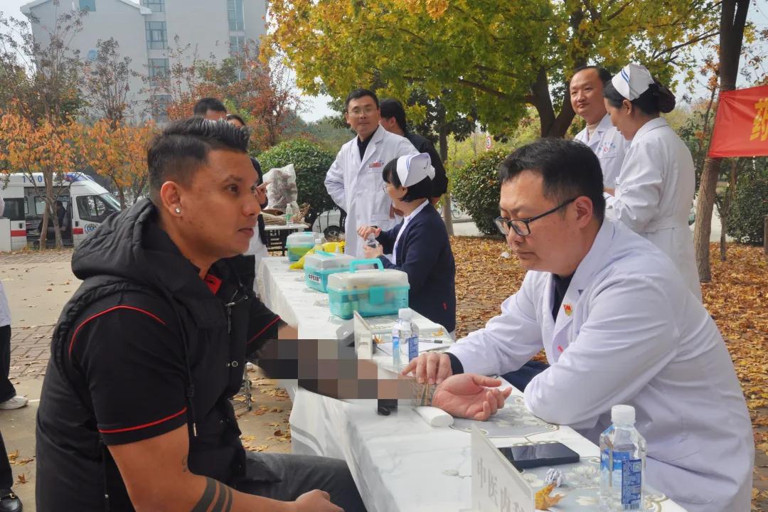 中醫義診區域,副主任中醫師彭壯、主治中醫師李佳攜手坐診,學生們排起了長長的隊伍前來體驗中醫號脈等特色診療服務。在漯河醫專學習的數名外國留學生深深熱愛著中華傳統文化,對中醫藥知識有著濃厚的興趣,在對外交流處王瑾老師的陪同下,紛紛參與體驗。市中醫院彭壯醫生為斯里蘭卡籍留學生仝深平中醫把脈問診,針對其脈象,給予合理的飲食建議和健康生活指導,受到外國留學生們的點贊!
