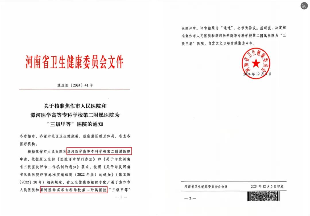 從1949年到2024年,漯河醫(yī)專第二附屬醫(yī)院(漯河市骨科醫(yī)院、漯河市立醫(yī)院)走過了75載不平凡的發(fā)展歷程。時值醫(yī)院建院75周年之際,喜報傳來:經(jīng)河南省衛(wèi)生健康委“三級甲等醫(yī)院”評審和公示,決定核準(zhǔn)漯河醫(yī)學(xué)高等專科學(xué)校第二附屬醫(yī)院為“三級甲等”醫(yī)院!
