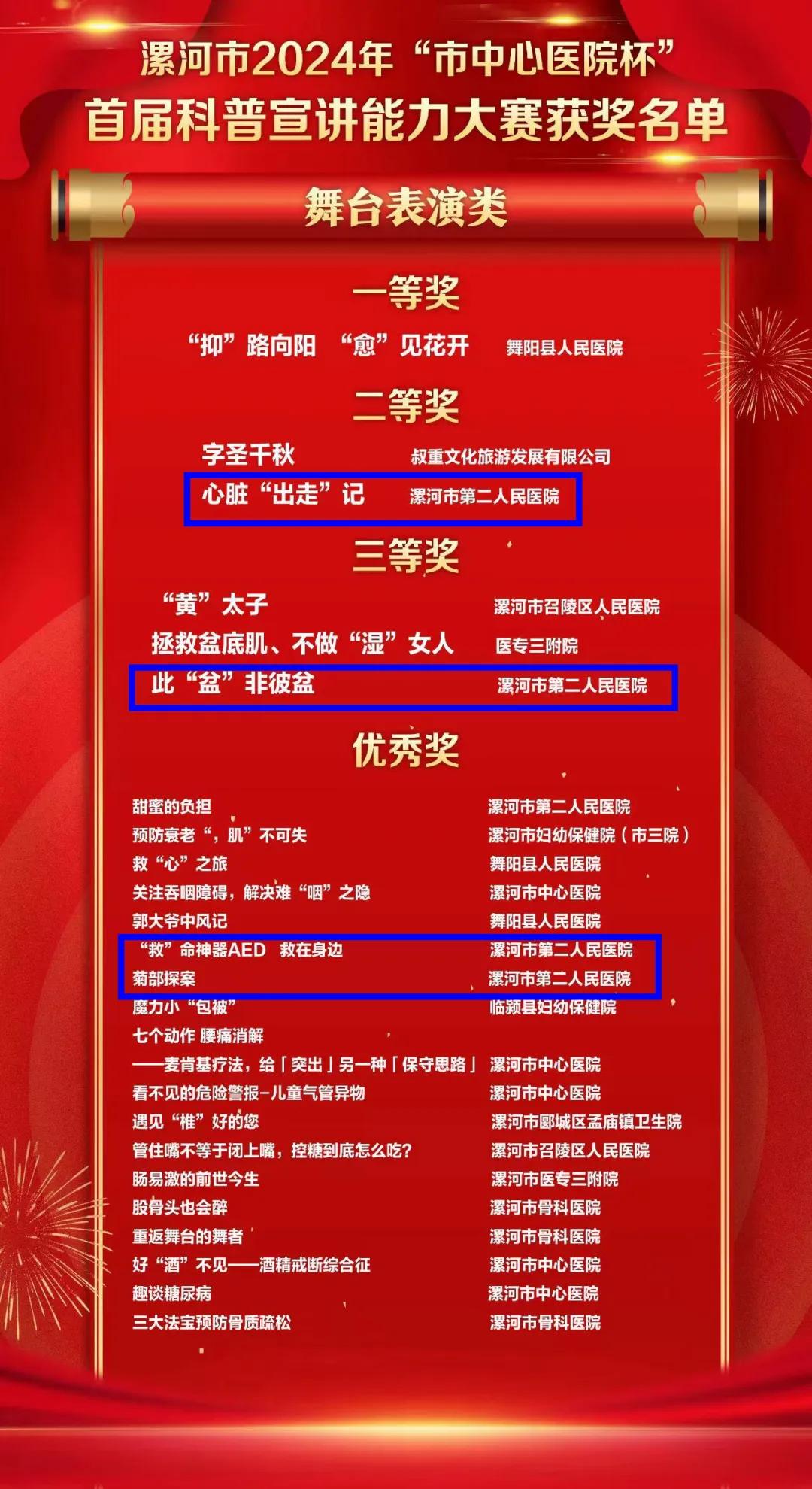 12月18日,由中共漯河市委宣傳部、中共漯河市委人才工作領導小組辦公室、漯河市科學技術協會、漯河市衛生健康委員會聯合主辦,漯河市中心醫院冠名,漯河日報社承辦的漯河市2024年“市中心醫院杯”首屆科普宣講能力大賽決賽落下帷幕。經過激烈角逐,市二院精心選送的參賽作品由劉橋、李媛、安自譚、袁泉、任崢崢出演的《心臟“出走”記》榮獲舞臺表演類二等獎;由井紅鴿、李靜麗、鄭家珍、丁歡歡、程亞麗出演的《此“盆”非彼“盆”》榮獲舞臺表演類三等獎;另有四個參賽作品榮獲優秀獎。