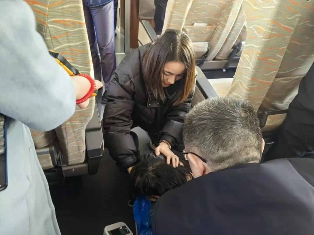為了確保旅客的安全,王爽和張圓圓決定留在她身邊,密切觀察病情變化。時間一分一秒過去,10多分鐘后,旅客的頸動脈波動突然變得微弱,意識也開始喪失。這一刻,張園園迅速反應,立即給予心臟按壓。經過一番努力,旅客的意識逐漸恢復,但緊接著,她又嘔吐起來,嘔吐物不偏不倚地濺在了張圓圓的身上。面對這突如其來的狀況,張圓圓沒有絲毫的嫌棄或抱怨,只是簡單地擦拭了一下身上的污物,便又立即投入到對旅客的監護中。王爽也迅速協助清理現場,確保旅客周圍環境的整潔與安全。然后再次回到旅客身邊,繼續觀察病情,測量生命體征。