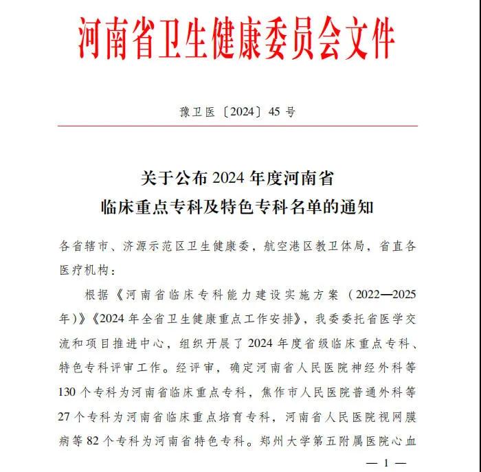 12月24日,河南省衛(wèi)生健康委下發(fā)《關(guān)于公布2024年度河南省臨床重點(diǎn)專科及特色??泼麊蔚耐ㄖ罚ㄔバl(wèi)醫(yī)〔2024〕45號(hào))。漯河醫(yī)專高等??茖W(xué)校第二附屬醫(yī)院運(yùn)動(dòng)醫(yī)學(xué)科、護(hù)理專科成功通過評審,被確定為河南省臨床重點(diǎn)培育???。