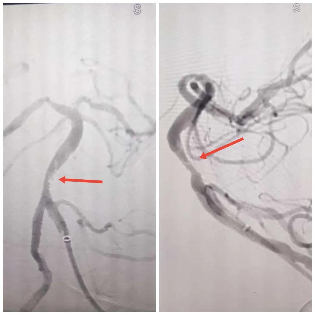 在經(jīng)造影后,主刀醫(yī)生腦一科副主任楊慶堂發(fā)現(xiàn)患者基底動(dòng)脈下段重度狹窄且狹窄段以遠(yuǎn)有大負(fù)荷血栓,其狹窄處考慮為動(dòng)脈夾層,手術(shù)難度及風(fēng)險(xiǎn)較大。楊慶堂副主任在彭壯副主任醫(yī)師的協(xié)助下運(yùn)用spaceman(太空人)技術(shù),中間導(dǎo)管抵近血栓抽吸配合支架拉栓,成功開通血管。再次造影可見基底動(dòng)脈管腔明顯增寬,遠(yuǎn)端血管顯影良好,且等待20分鐘后造影仍顯示血流通暢。楊慶堂副主任考慮到本次手術(shù)時(shí)間不宜過長,現(xiàn)患者基底動(dòng)脈及分支前向血流維持良好,給予其抗栓藥物應(yīng)用后結(jié)束手術(shù),并建議患者3個(gè)月后復(fù)查造影,明確其基底動(dòng)脈夾層情況。