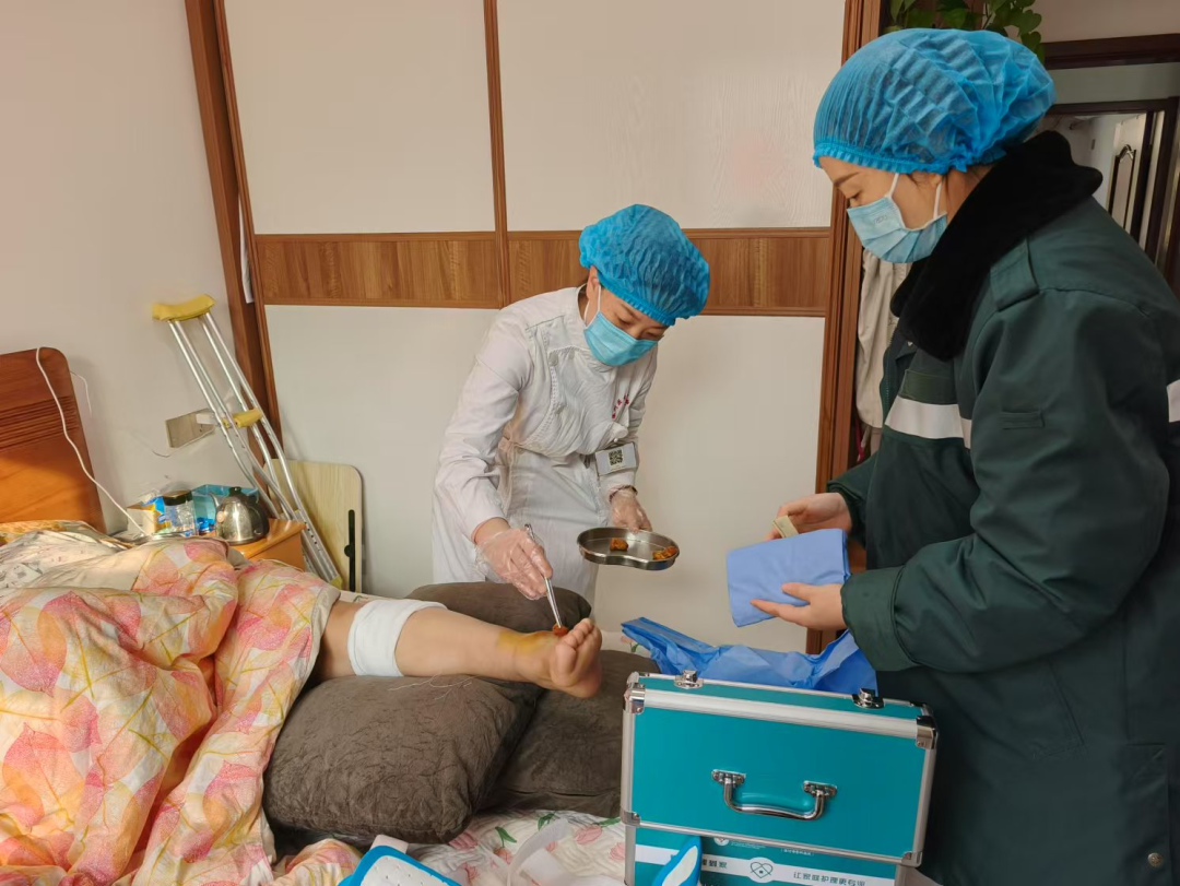 接到任務(wù)后,張燕燕護(hù)士長帶領(lǐng)科室主管護(hù)師孟丹丹一起按照約定時間上門服務(wù),在對患者做了系統(tǒng)的傷口評估后,嚴(yán)格按照操作標(biāo)準(zhǔn),動作輕柔又利落地對傷口進(jìn)行了創(chuàng)面消毒、換藥、包扎,同時耐心為患者及家屬講解了傷口居家護(hù)理的注意事項(xiàng)及患肢的功能鍛煉要點(diǎn)等。