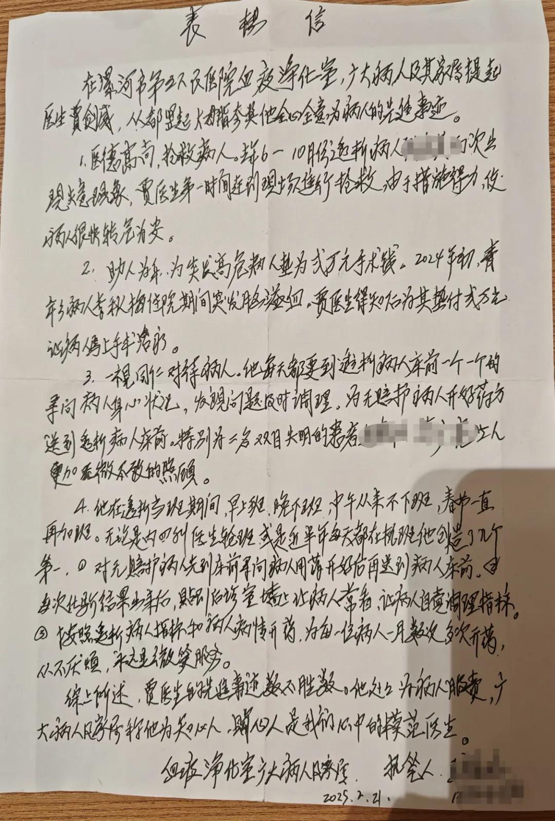 “他處處為病人服務,廣大病人及家屬稱他為知心人、貼心人,是我們心中的模范醫生......”信箋上,溫暖的字句自然流淌,言語間都是對賈劍威醫生的信任與感激。