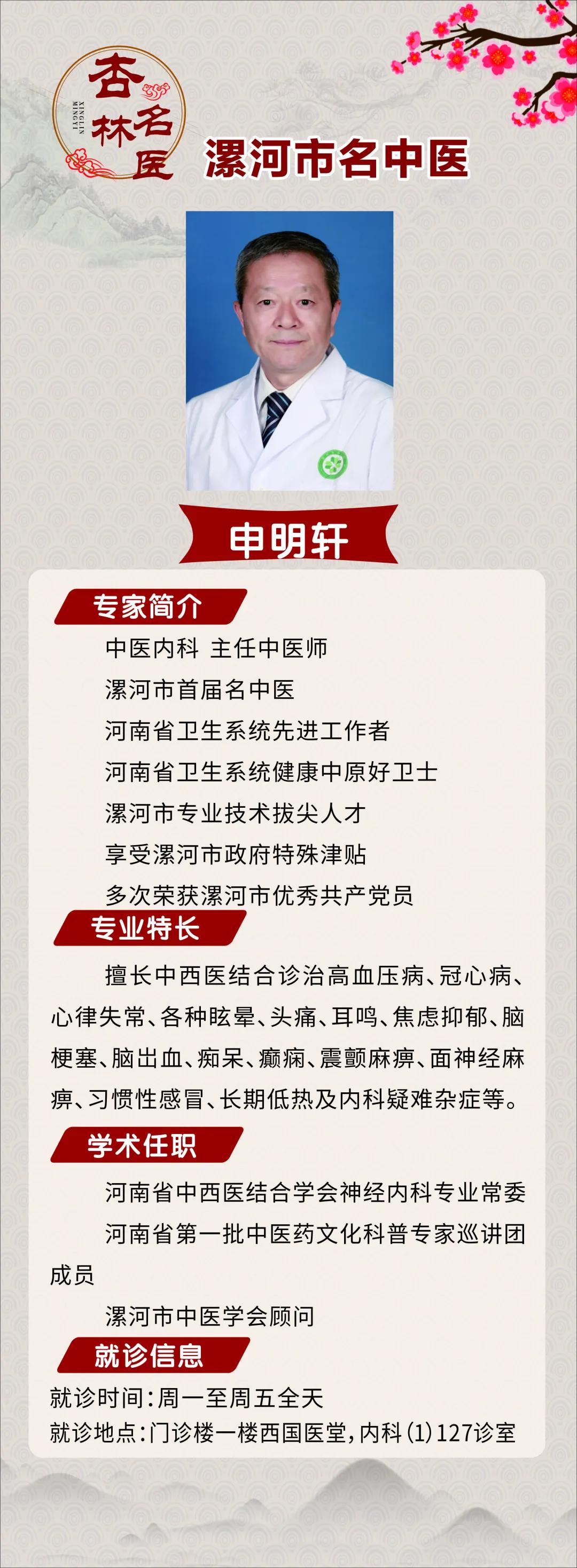 承岐黃薪火、傳國醫精髓。為方便群眾就醫咨詢,更好地傳承中醫藥文化,漯河市中醫院推出《杏林名醫》系列欄目,固定推送和展示省、市級名中醫的風采,專家們的診療擅長和出診時間一目了然,方便您的就診需求。敬請關注!