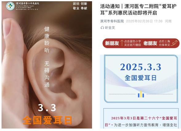 3月3日是第26個(gè)全國(guó)“愛耳日” ,為進(jìn)一步普及聽力健康科學(xué)知識(shí),增強(qiáng)全社會(huì)聽力殘疾預(yù)防意識(shí)和預(yù)防能力,漯河醫(yī)專二附院(漯河市骨科醫(yī)院、漯河市立醫(yī)院)耳鼻咽喉科牽頭開展了一系列內(nèi)容豐富、形式多樣的愛耳日宣傳教育活動(dòng)。