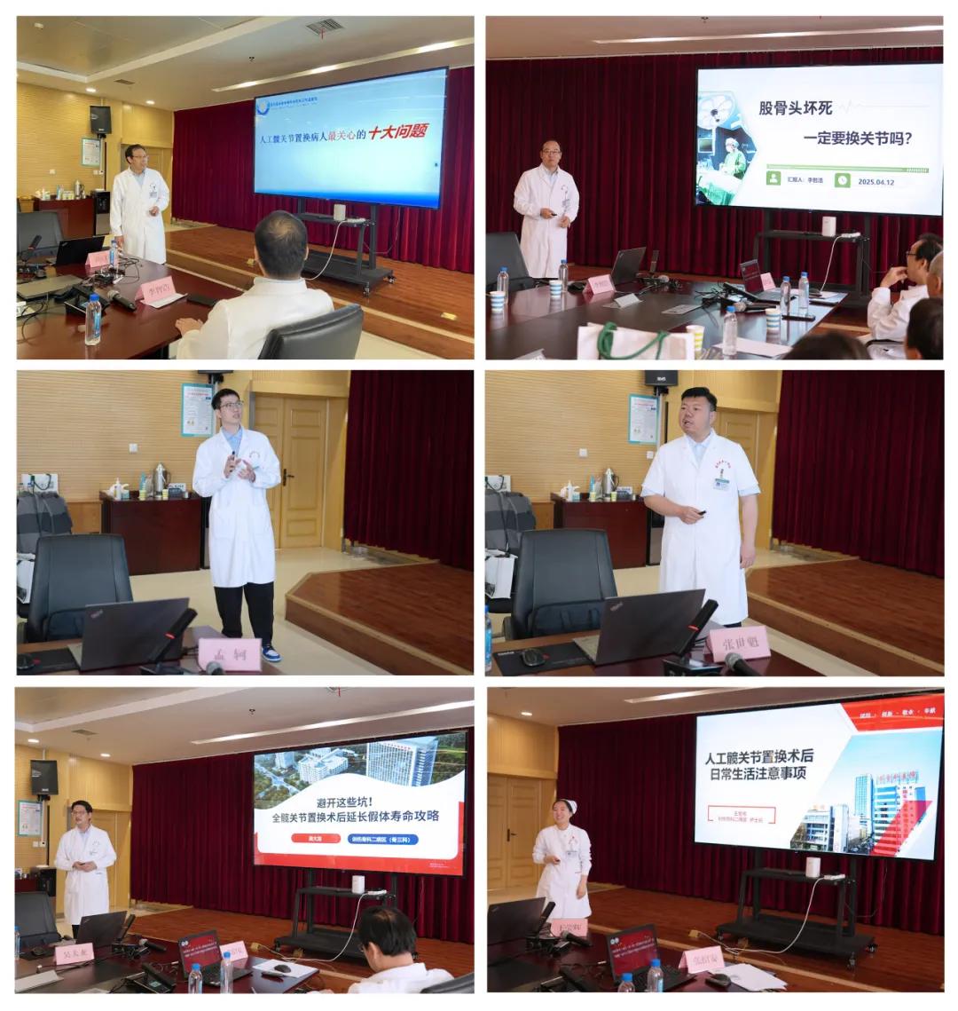隨后,精彩紛呈的科普講座環節正式開啟。張紹安主任率先圍繞 “人工髖關節置換患者最關心十大問題” ,從手術原理到術后康復,深入淺出地解答了病友們心中的疑惑。李智浩主任則聚焦 “保頭或換髖如何選擇” 以及 “人工髖關節置換術后肌力訓練” 這兩個關鍵話題,進行了細致入微的分析。幫助病友們了解不同治療方案的優劣,掌握科學的康復訓練方法。吳大龍醫生帶來的 “避開這些坑!全髖關節置換術后延長假體壽命攻略”,可謂是滿滿的干貨。他用通俗易懂的語言為病友們傳授實用的經驗,讓大家明白如何在日常生活中更好地保護假體。孟軻醫生講解 “髖關節置換術后預防假體脫位常識”,從細節入手,強調預防的重要性。張世魁醫生的 “如何有效‘補鈣’”,讓病友們了解到補鈣對于骨骼健康的關鍵作用以及正確的補鈣方法。王瑩輝護士長分享 “髖關節置換術后日常生活注意事項”,涵蓋了衣食住行各個方面,為病友們的術后生活提供了貼心指導。
