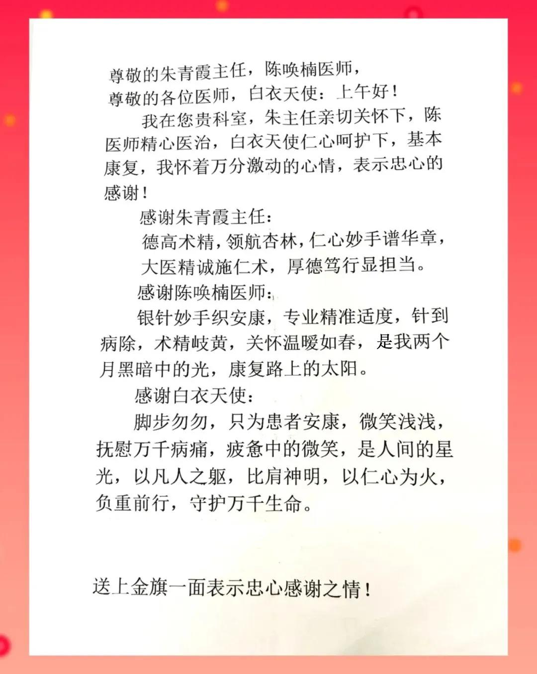 近日,市二院中醫針灸科門診醫護人員一如既往地忙碌著。突然,走廊里傳來一陣熱烈的掌聲,原來,74歲的田大叔在家人陪伴下,手捧錦旗和感謝信來到醫院。田大叔激動地展開感謝信,聲情并茂地朗讀起來,說到動情處更是眼含熱淚,字里行間飽含著對中醫針灸科主任朱青霞的誠摯謝意和對整個醫護團隊精湛醫術與暖心服務的認可與贊美。讀完,田大叔深深地鞠躬致謝,這一躬身,更是見證中醫針灸科‘破冰’三十年病痛,醫患同心最好的詮釋。