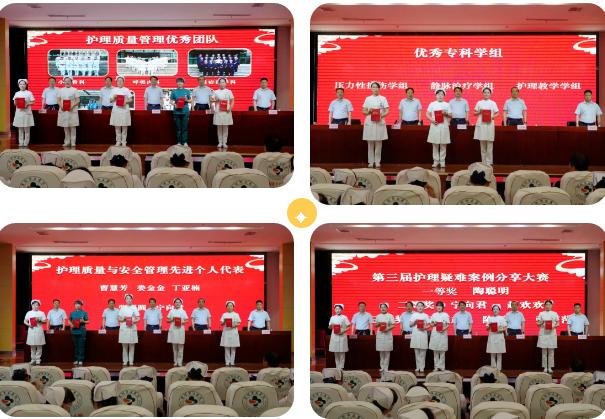 小兒骨科、呼吸內科、重癥醫學科、急診醫學科、中醫骨傷科被評為護理質量管理優秀團隊,壓力性損傷學組、靜脈治療學組和護理教學學組被評為優秀??谱o理學組,曹慧芳、婁金金、丁亞楠、張圓圓、寧向君等護理質量與安全管理先進個人依次上臺,受到表彰。陶聰明等疑難案例獲獎者、華麗榮等技能競賽獲獎者及優秀指導老師朱亞楠也受到表彰。