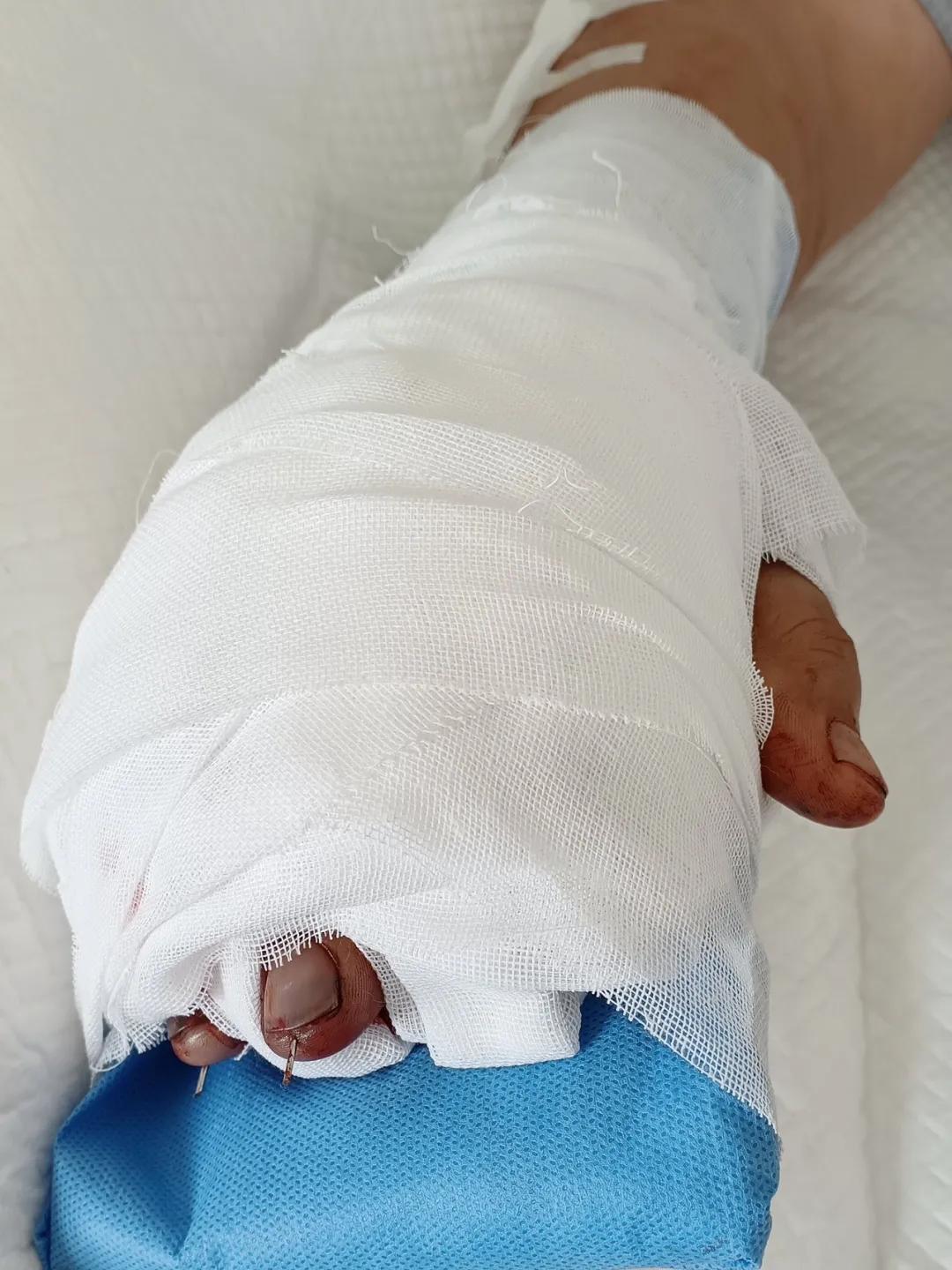 5月20日,市二院顯微外科燒傷整形科收治了3例因麥收被農機“咬傷”、農具劃傷的患者。其中,56歲的劉某在收麥子時被打谷機皮帶絞傷右手,致手掌、食指、中指、環指嚴重毀損傷,骨、關節外露,因當地醫院無法治療,被家人緊急送往市二院顯微手足燒傷整形外科救治。“當時整個右手血肉模糊,看上去都是爛的,我以為這個手是肯定保不住了。”患者家屬回憶當時的場景仍然膽戰心驚。