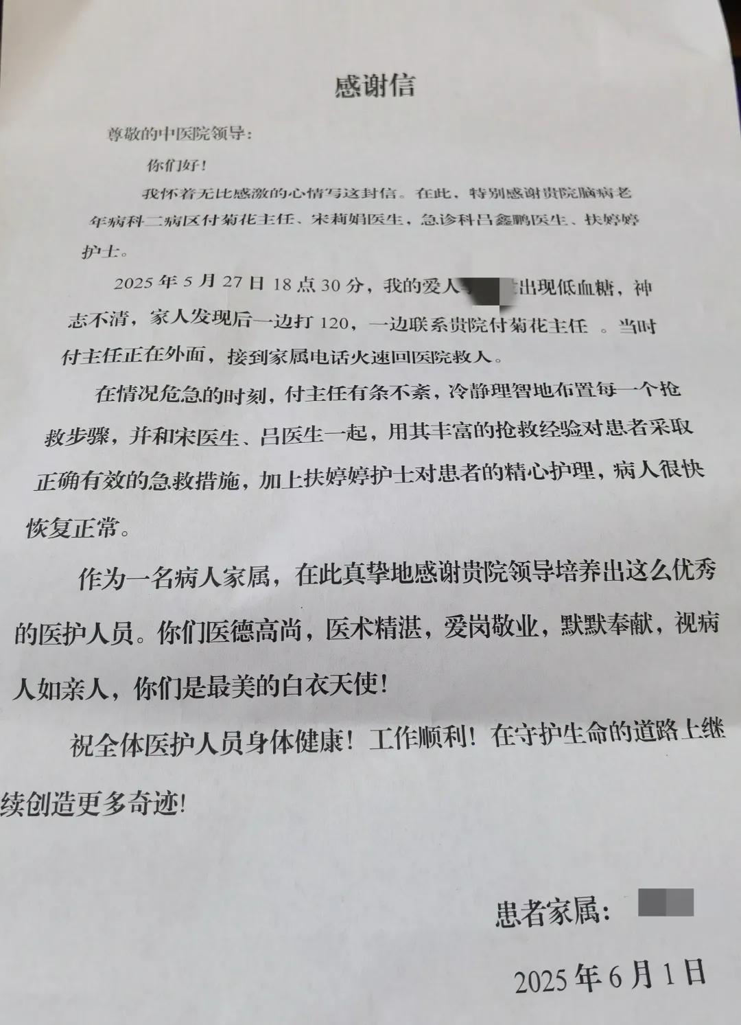 據了解,該女士其丈夫患腦血管疾病,曾在市中醫院腦二科就診,是腦二病區付菊花主任的病人,后多次到腦二科找付醫生復診。5月27日晚,患者病情危急,患者家屬趕忙聯系付菊花,付菊花當時已下班回家,她接到電話后立即與院急診科和腦二科宋莉娟醫生聯系開展相關救治工作并抓緊到醫院參與救治,還用“醫生全年無休守護患者”的暖心話語安慰焦急的患者家屬。急診科的呂鑫鵬、扶婷婷也對患者采取正確有效的急救措施及精心護理,經過各科室的精心救治,患者癥狀快速好轉,病人家屬特送來信表示感謝。