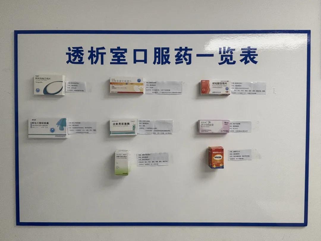 隨著醫學技術的發展,高齡患者越來越多,即便醫護人員反復講解用藥方法,患者和家屬仍可能因記憶模糊、理解偏差導致用錯藥。為了解決這一難題,血液凈化室推行 “口服藥上墻” 舉措,患者可以拿著自己藥盒與墻上的藥盒進行一一對照。藥盒旁配有詳盡說明,圖文并茂,直觀易懂,有效避免用藥誤區,確保患者用藥安全,提升治療效果。