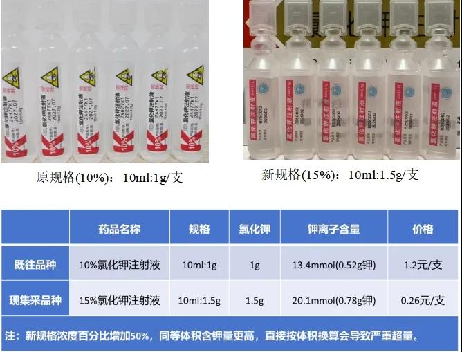 氯化鉀注射液是臨床常用的電解質補充劑,廣泛用于治療和預防低鉀血癥,以及洋地黃類藥物中毒引起的頻發性、多源性早搏或快速心律失常、低鉀性肌無力等。隨著第十批國家藥品集中采購品種的落地實施,氯化鉀注射液規格由以往長期使用的10ml:1.0g/支,濃度10%調整為10ml:1.5g/支,濃度15%,作為A類高警示藥品,其規格、濃度的變化直接關系到臨床用藥安全,若操作不當可能引起嚴重用藥錯誤。本文系統梳理臨床配制關鍵風險點,幫助醫務人員合理應用集采氯化鉀注射液,避免因劑量變化導致用藥風險。