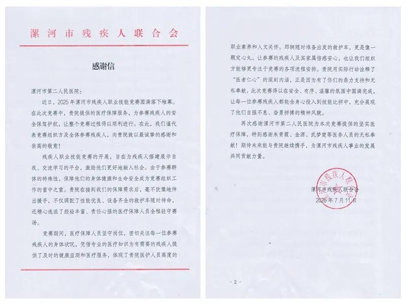 近日,市二院收到一封來自市殘聯(lián)發(fā)來的感謝信。信中高度贊譽(yù)醫(yī)院在2025年全市殘疾人職業(yè)技能競(jìng)賽期間提供的全方位醫(yī)療保障服務(wù),稱其“用實(shí)際行動(dòng)詮釋醫(yī)者仁心,為賽事筑起堅(jiān)實(shí)的安全防線。”