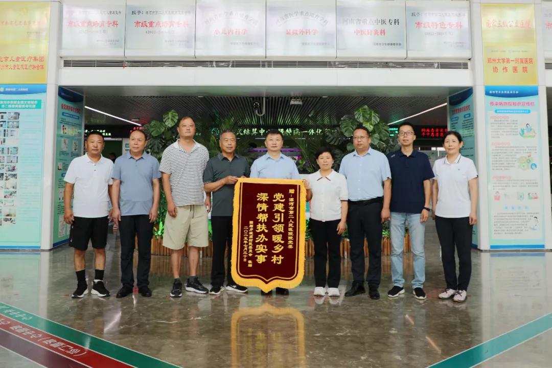 7月30日上午,臨潁縣固廂鄉(xiāng)城頂村黨支部書記楊勝武帶領(lǐng)村“兩委”干部,代表全體村民專程來到市二院,將一面飽含深情的錦旗送到院黨委書記魏松,黨委副書記、院長胡海英手中,以此感謝市二院及派駐第一書記在駐村幫扶中給予的堅定支持和為村里帶來的實際變化。