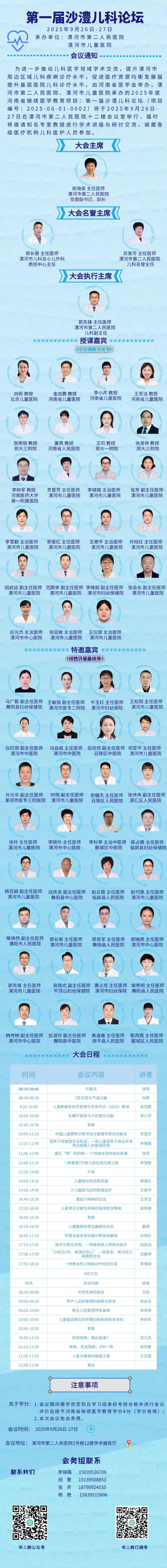 為進一步推動兒科醫學領域學術交流,提升我市及周邊區域兒科疾病診療水平,促進醫療資源均衡發展,提升基層醫院兒科診療水平。由河南省醫學會主辦,漯河市第二人民醫院、漯河市兒童醫院承辦的2025年度河南省繼續醫學教育項目:第1屆沙澧兒科論壇 (項目編號:2025-06-01-0002)學術會議將于2025年9月26-27日在漯河市第二人民醫院舉行,現將有關事項通知如下:
