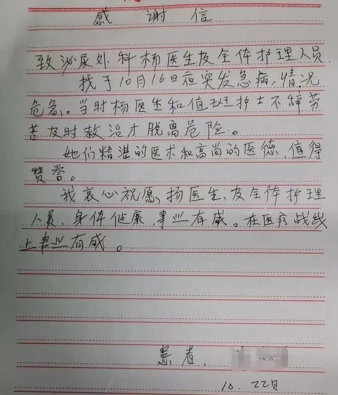為感謝楊艷霞醫(yī)生的及時(shí)救治和護(hù)士們的貼心照顧,出院后患者特意寫下一封感謝信,字里行間滿是對楊醫(yī)生專業(yè)醫(yī)術(shù)、敬業(yè)精神和人文關(guān)懷的由衷贊譽(yù),也表達(dá)了對醫(yī)院泌尿外科醫(yī)療服務(wù)的高度認(rèn)可。