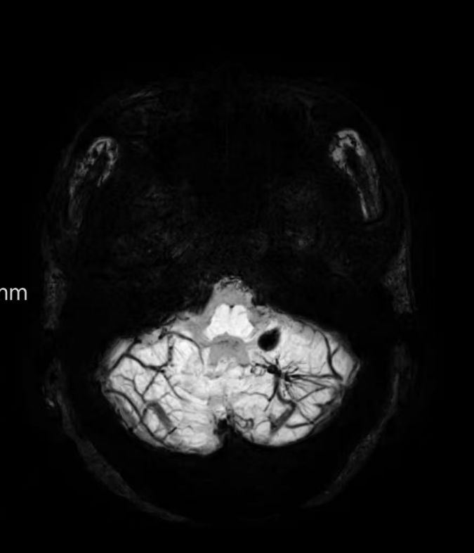 我們大腦里密密麻麻的靜脈血管,在常規影像上是“灰蒙蒙”的一片。但SWI對脫氧血液極其敏感,能將靜脈血管清晰地顯示為黑色的細線。這個本領非常有用: