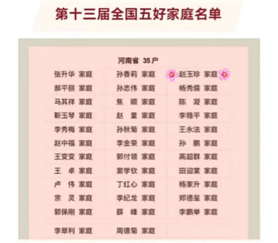 5月15日,全國婦聯表彰997戶全國五好家庭,鄭州市3戶家庭上榜,高新區石佛辦事處趙玉珍家庭獲得第十三屆“全國五好家庭”榮譽稱號。